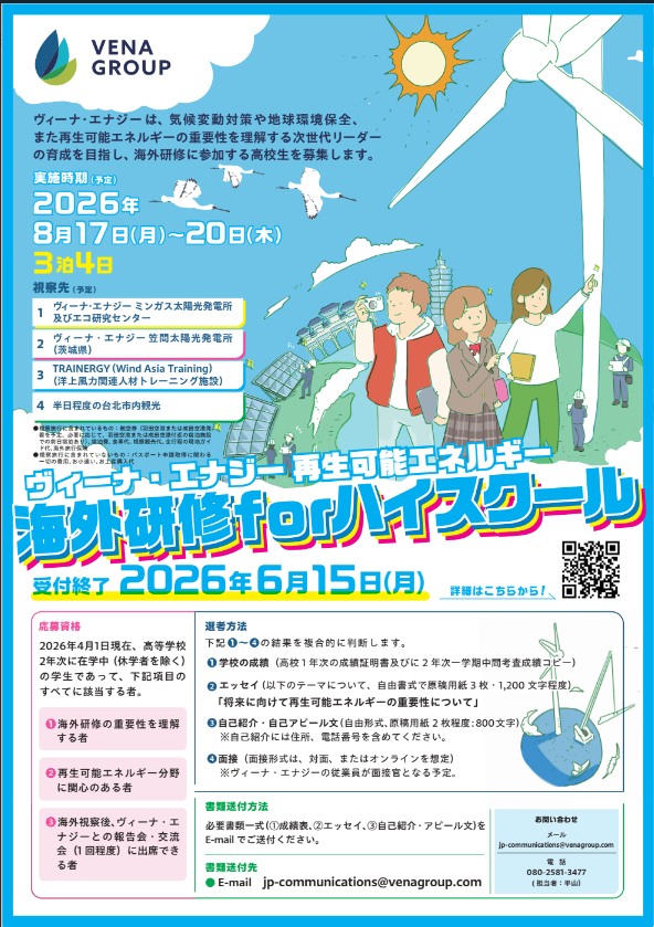 アジア太平洋地域でグリーンソリューション事業を展開するヴィーナ・グループ(Vena Group)は、 海外研修プログラム 第4回「ヴィーナ・エナジー再生可能エネルギー海外研修 for ハイスクール」を2026年8月17日より開催することを発表しました。